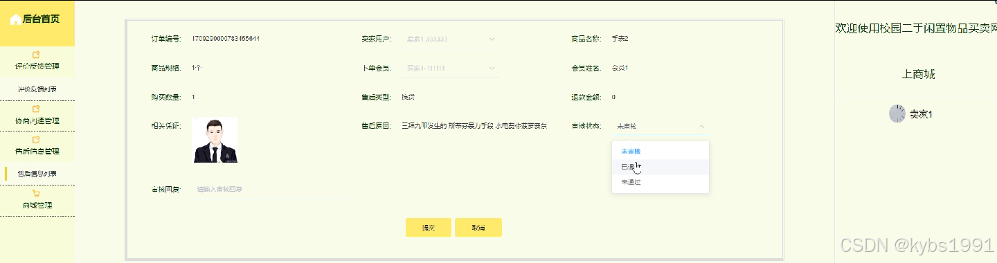 售后信息管理,在售后信息列表中可以查看索引、卖家用户、商品名称、相关凭证、售后原因等信息,可查看详情、审核回复等相应操作,如图5-11所示。