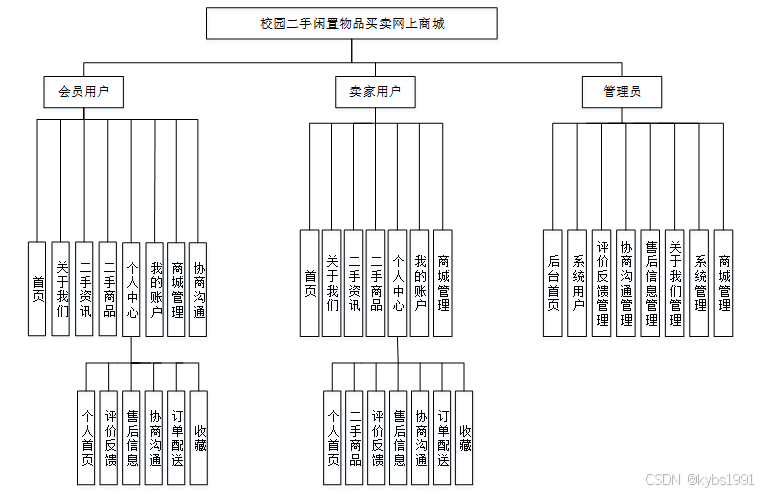 经过系统需求分析,该校园二手闲置物品买卖网上商城的设计与实现功能结构图如图4-1所示: