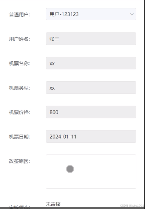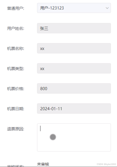 用户点击“退票”按钮会显示出退票申请界面,其中普通用户、用户姓名、机票名称、机票类型、机票价格、机票日期是系统自动生成的,用户只需要输入退票原因进行提交退票申请。界面如下图4-12所示。