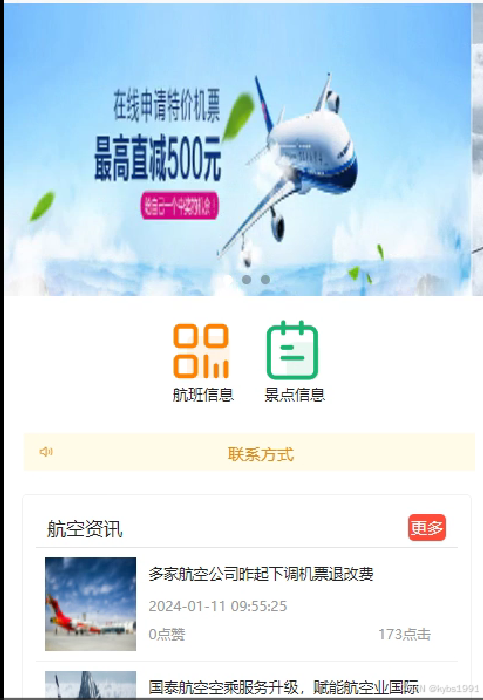 (2)查看航空票务管理系统的首页信息:航空票务管理系统的首页信息包含了首页、公告信息、航空资讯、景点信息、航班信息、我的(基本信息、机票购买、改签信息、退票信息、收藏)等。