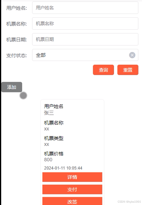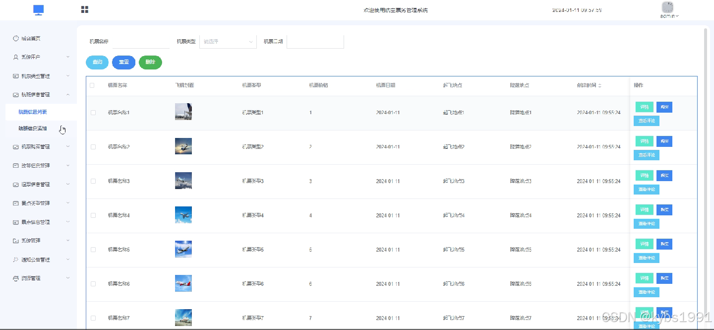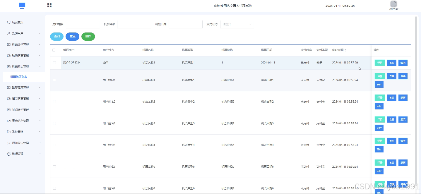 - 机票购买管理:管理员可在“机票购买列表”查看所有用户的购票信息,并可对购票信息进行详情、查询或删除等操作;