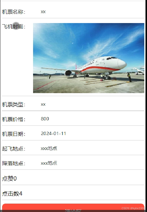 (4)航班信息:用户可以查看航班信息,在查询到自己想要了解的航班信息的时候,可以进入查看详细的介绍,点击“购买”这一按钮以后会跳转到购买信息填写的界面,根据提示填写好购买的信息,点击“提交”以后购买就完成了,在航班信息详情这个界面,同时支持用户对喜欢的航班信息进行收藏、点赞以及评论的功能。