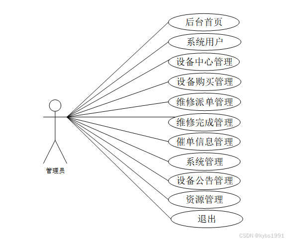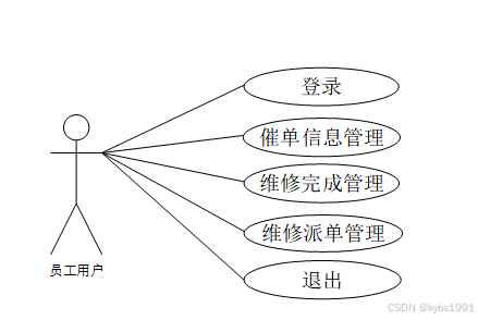 SPRINGBOOT污水设备管理系统中员工用户包含注册登录、首页、维修派单管理、维修完成管理、催单信息管理等功能,对应角色用例图如图3.2所示: