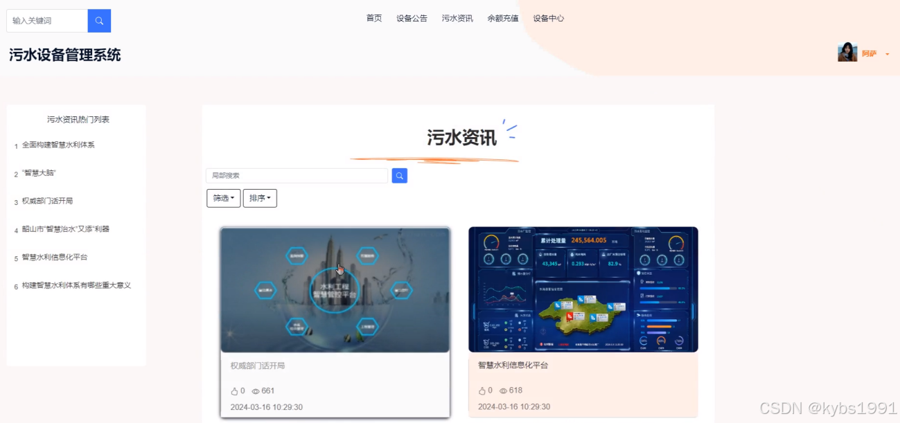 (5)污水资讯:展示管理员后台管理的污水资讯,左侧是污水资讯热门列表,展示前六的热门污水资讯,可以浏览查看具体污水资讯详情,可在污水资讯内发布评论以及回复评论。能进行局部搜索,可对污水资讯进行排序,还可以对污水资讯进行点赞、收藏。
