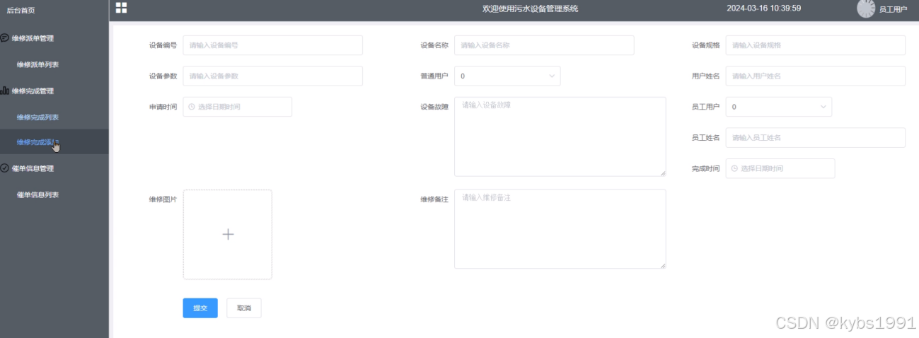维修完成管理:维修完成列表、维修完成添加子菜单。维修完成列表展示所有用户提交的维修完成记录,能根据设备名称、用户姓名、员工姓名搜索,可查看维修完成详情。维修完成添加:可提交新的维修完成单子。维修完成提交如图5-11所示。