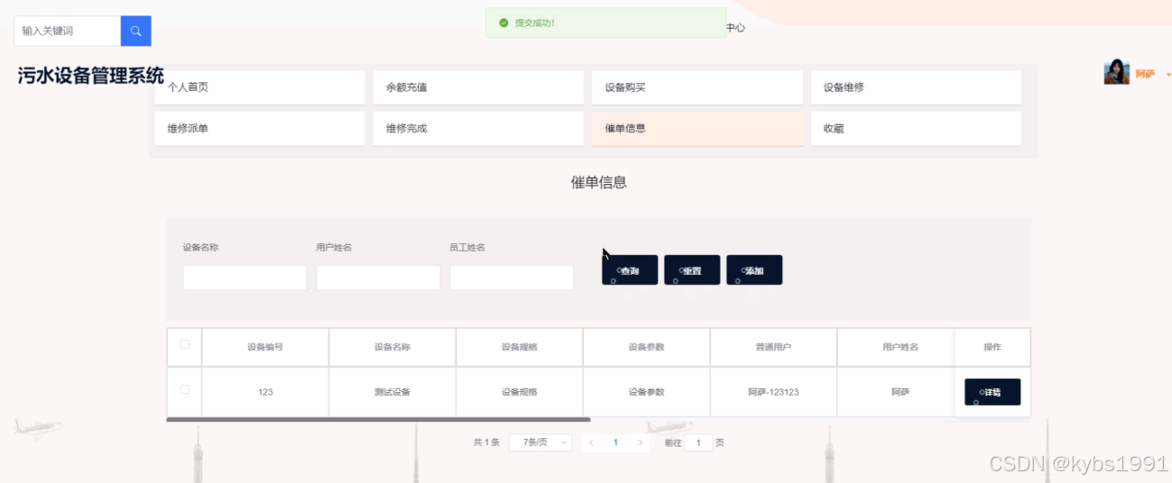 本系统在设计和实现过程中,通过深入的市场调研并充分考虑了用户需求和业务场景,采用了Spring Boot等成熟技术,确保了系统的稳定性、可扩展性和易用性。经过功能测试,本系统稳定运行,各项功能均达到预期效果。系统的运行效果表明,其能够实时掌握设备运行状态,快速响应维修需求,为污水设备的高效管理提供了有力支持。