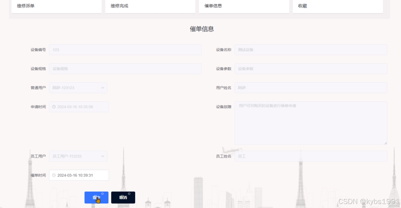 (8)催单信息管理:催单信息列表。催单信息列表展示所有用户提交的催单信息记录,能根据设备名称、用户姓名、员工姓名搜索,可查看催单信息详情。