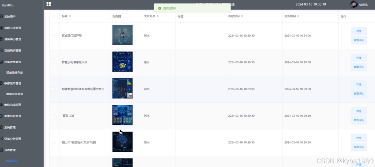 (11)资源管理:子菜单污水资讯、资讯分类。污水资讯主要是对资讯信息的管控,包含对其增删改查操作还能查询评论,新增的污水资讯将会在前台展示。资讯分类主要是管控资讯分类,添加的资讯分类运用在污水资讯上。