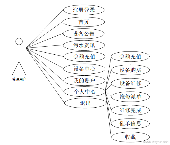 SPRINGBOOT污水设备管理系统中普通用户包含注册登录、首页、设备公告、污水资讯、余额充值、设备中心、我的账户、个人中心等功能,对应角色用例图如图3.1所示:
