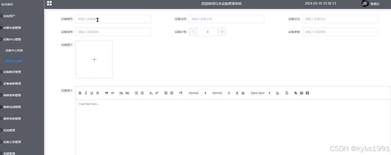 设备中心管理:存在设备中心列表、设备中心添加子菜单。设备中心列表展示所有添加的设备中心,能根据设备名称、设备状态进行关键字搜索,支持删除、编辑、查看、重置查询条件操作以及查看设备中心详情,设备中心添加页面输入设备编号、设备名称、设备状态、设备规格、设备价格、设备参数、上传设备图片、设备简介等相关字段值添加设备中心。设备中心添加如图5-13所示:
