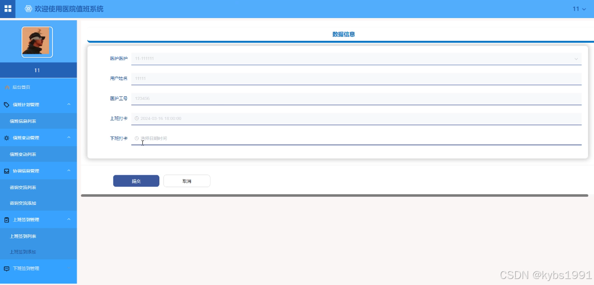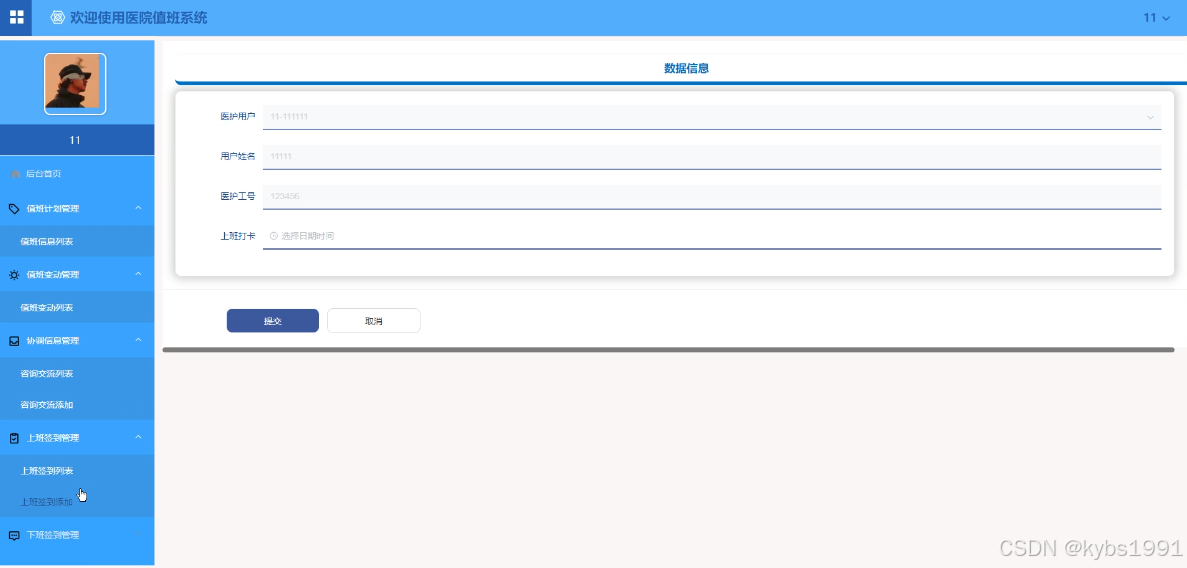 上班签到管理模块:医护用户可以提交上班签到信息,管理员进行审核。医护用户上班签到提交界面如下图所示。