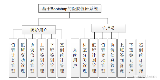 医院值班系统可以划分为医护用户模块和管理员模块两大部分。