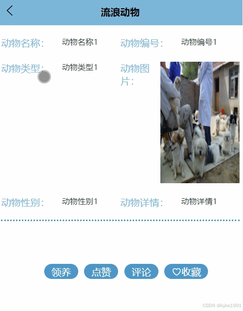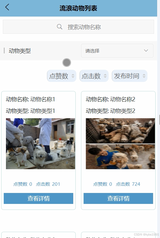 (3)流浪动物:可查所有流浪动物,支持局部搜索和下拉(筛选、排序)搜索,流浪动物推荐,点击可查看详情,进行收藏、点赞、评论,并可点击领养操作。