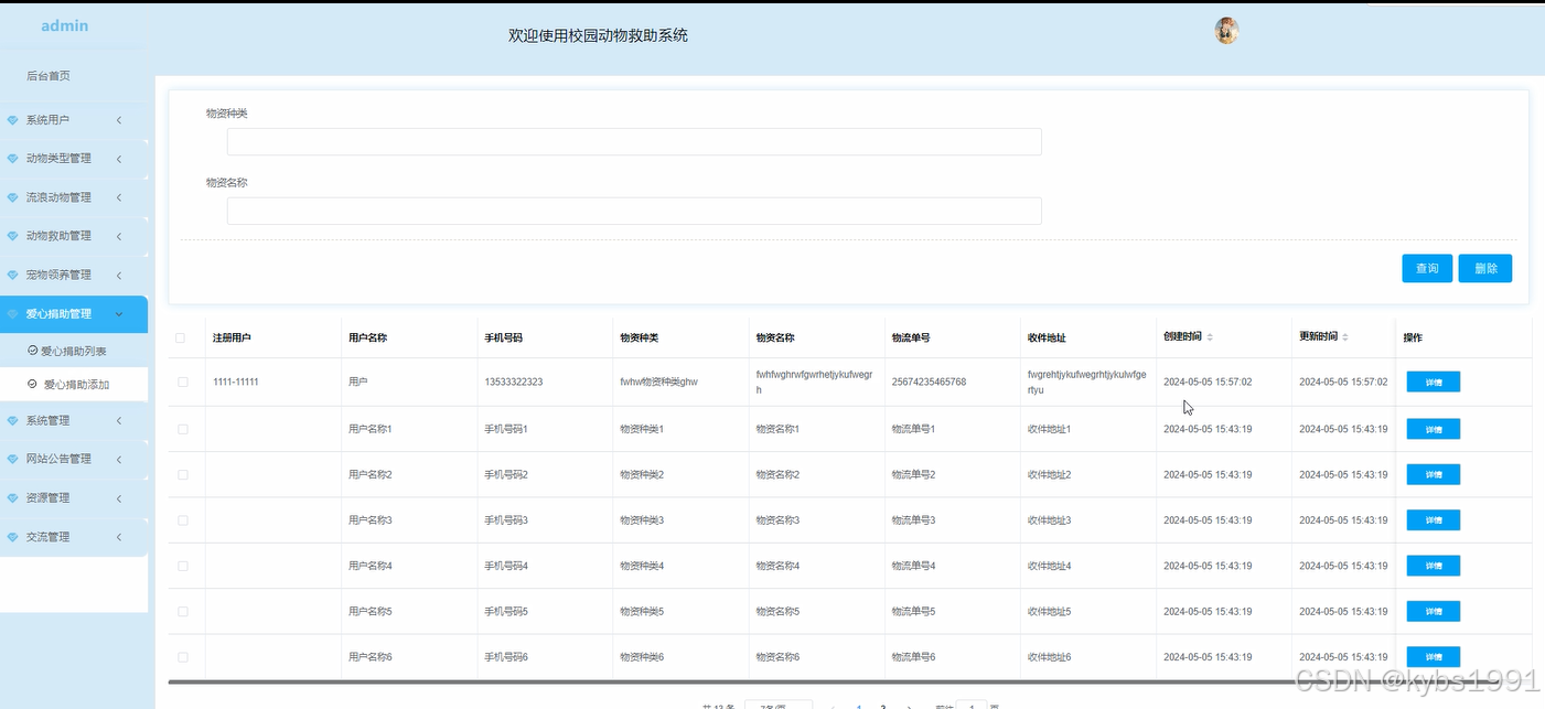 (6)爱心捐助:管理员点击“爱心捐助”,可查看所有爱心捐助信息,进行添加、查询、删除操作,支持物资名称、物资种类进行搜索,可点击查看详情。