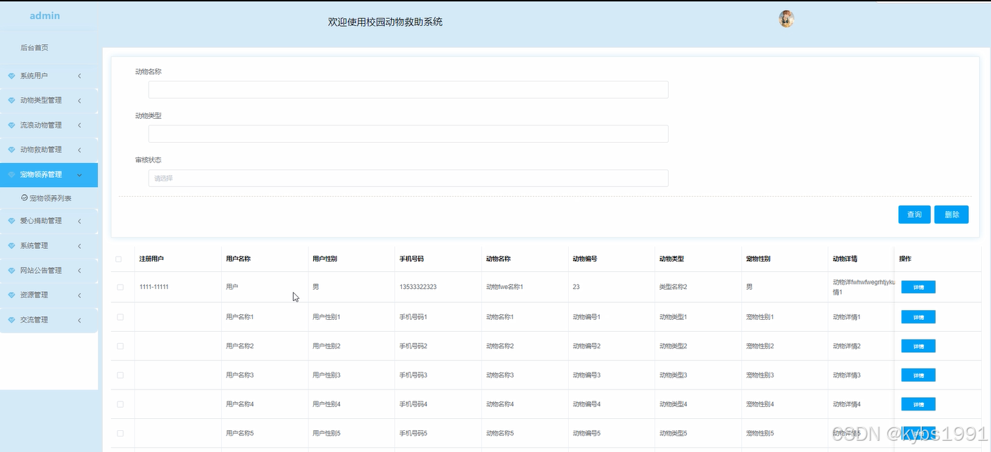 (7)点击“宠物领养”,可查看宠物领养信息,进行查询、删除、重置操作,支持动物类型、动物名称进行搜索,可点击查看详情。