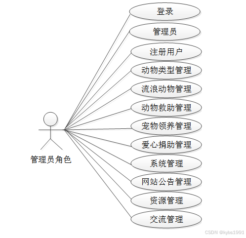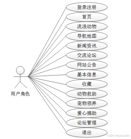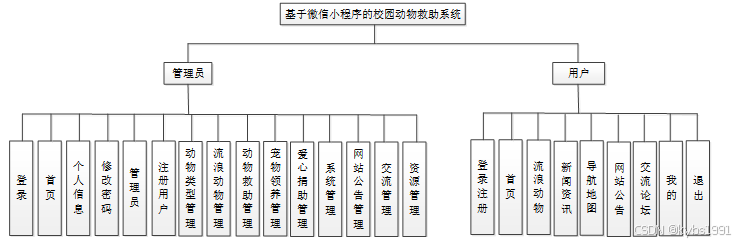 基于微信小程序的校园动物救助系统整体的功能模块包括管理员+注册用户两个模块,实现了对流浪动物相关信息的查询管理,系统的功能结构图如下图4-1所示。