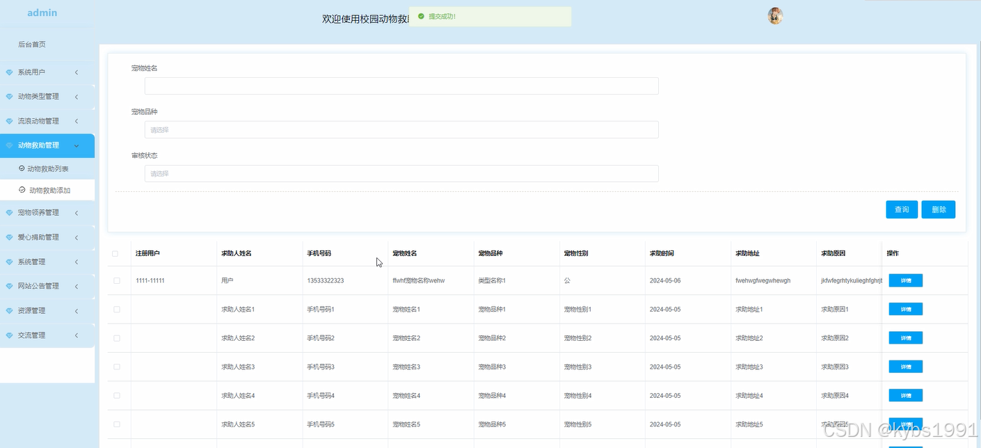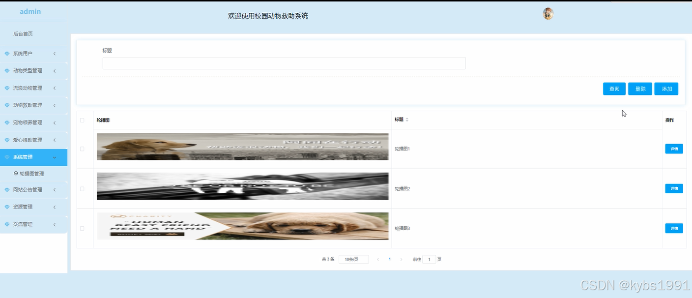 (4)动物救助:管理员点击“动物救助”,可查看所有动物救助信息,进行添加、查询、删除操作,支持宠物名称搜索,并可点击查看详情。