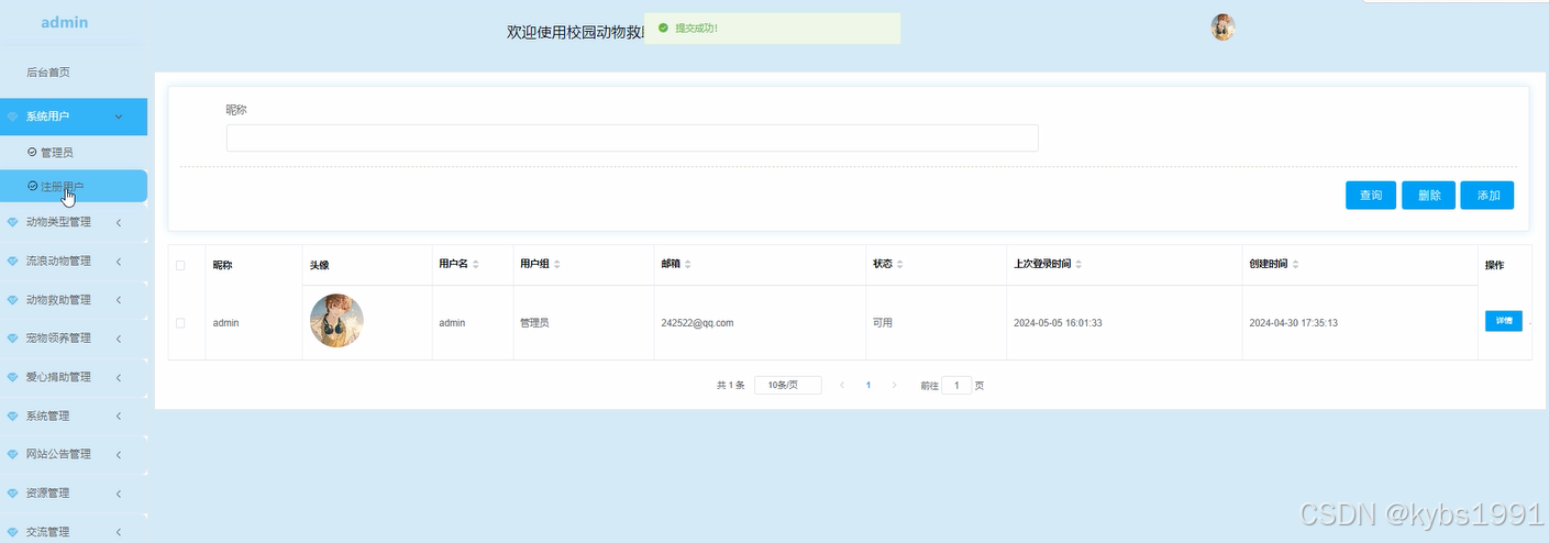 (2)系统用户:可对注册用户和管理员进行管控,包括进行增删改查操作,点击可查看详情。