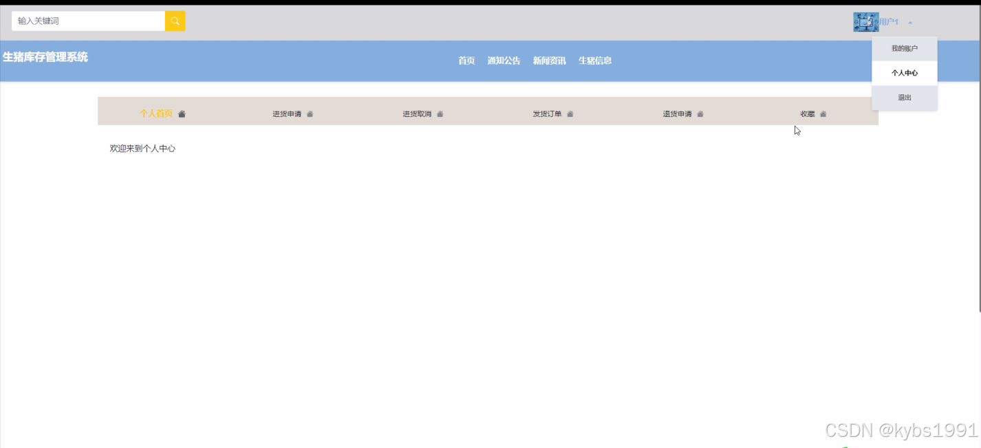 当前台用户点击右上角“我的”这个按钮,会出现子菜单,不同用户角色对应不同的信息管理功能。普通用户点击“个人中心”可以对个人首页、进货申请、进货取消、发货订单、退货申请、收藏管理。普通用户个人中心管理如下图4-7所示。