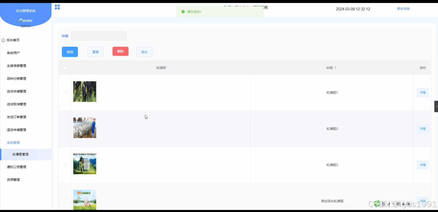 管理人员在“系统管理”这一菜单下是可以对生猪库存管理系统内的轮播图进行添加修改的,其系统管理界面如下图4-12所示。