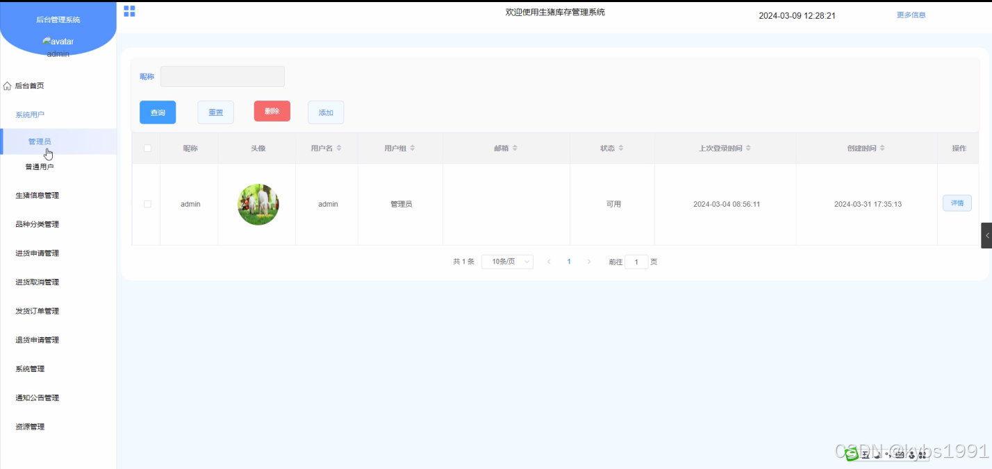 生猪库存管理系统中的管理人员在“系统用户”这一菜单是中可以对注册的普通用户、管理员进行管控。界面如下图4-10所示。