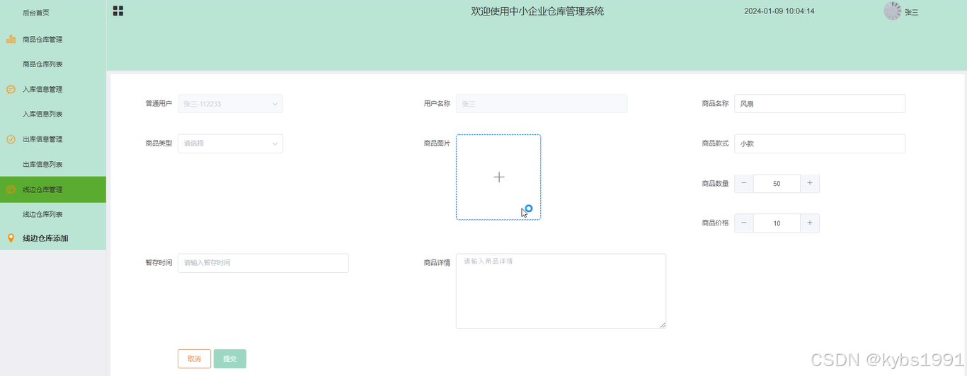线边仓库管理:用户点击可查看线边仓库列表和线边仓库添加;点击“线边仓库添加”,选择普通用户,输入用户名称、商品名称,上传商品图片,输入商品款式、商品数量、商品价格、暂存时间和商品性情,点击“提交”按钮进行添加。界面如下图所示。