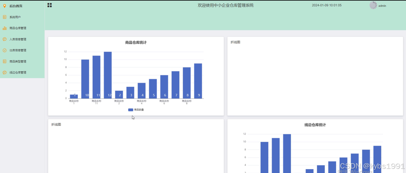 后台首页:管理员点击可查看商品仓库、入库信息统计、出库信息统计和线边仓库统计数据图。界面展示如下图4-1所示。