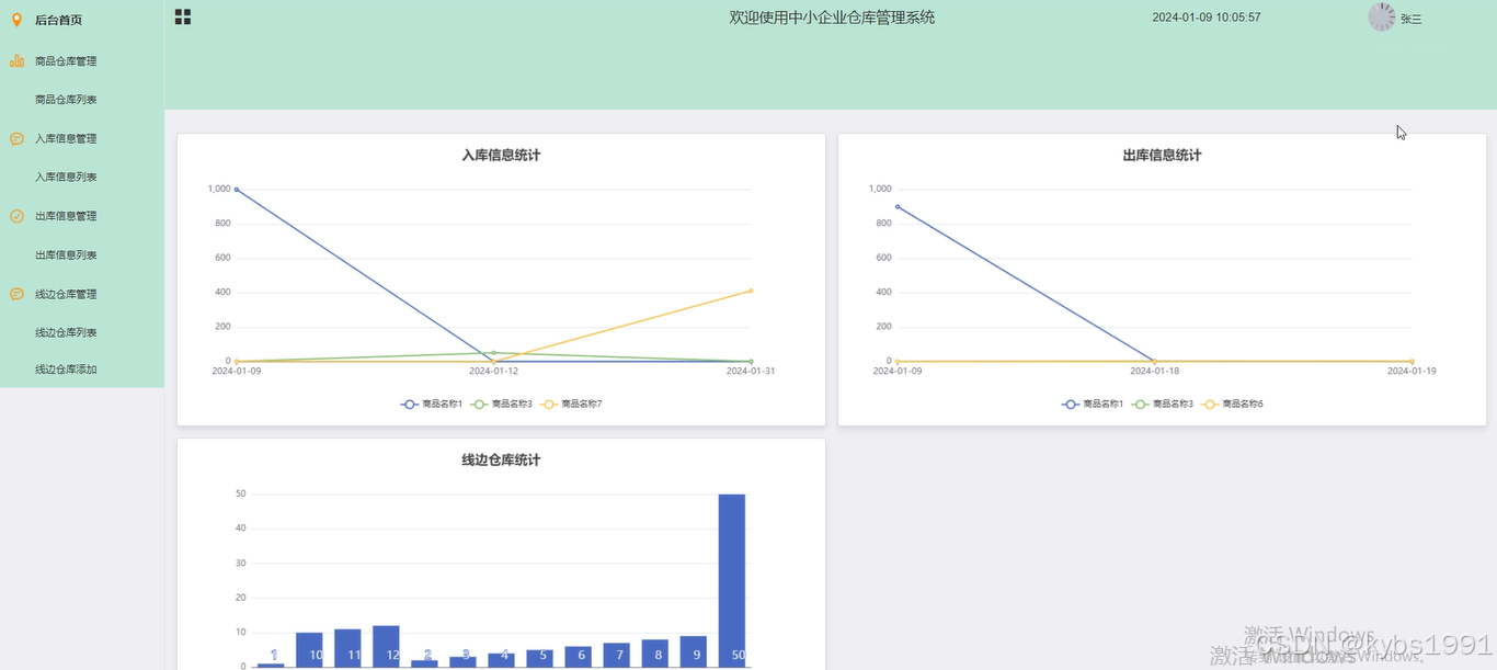 (2)后台首页:管理员点击可查看商品仓库、入库信息统计、出库信息统计和线边仓库统计数据图。