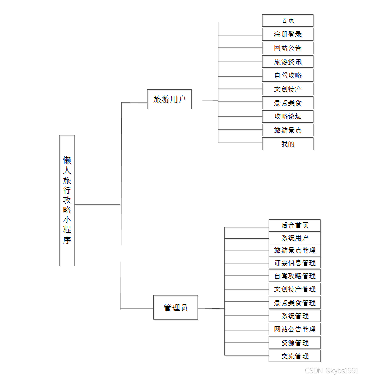 按照懒人旅行攻略小程序的角色,主要包括旅游用户模块和管理员模块这三大部分。