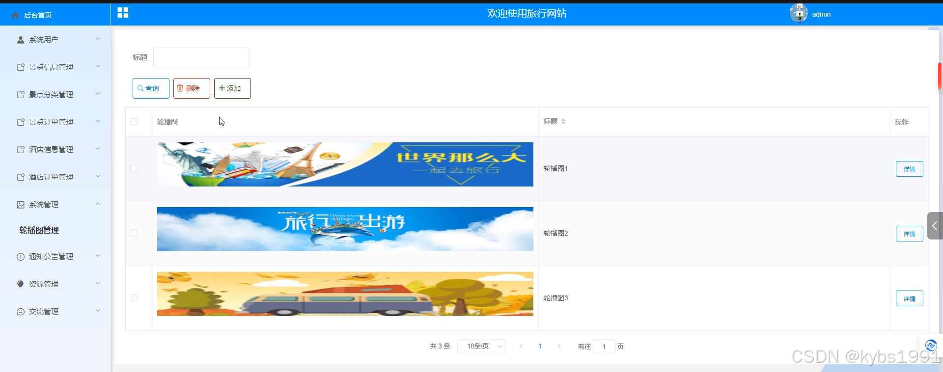- 系统管理:管理员在“系统管理”这一菜单下对轮播图进行管控,可以对轮播图信息进行查询、添加和删除操作。
