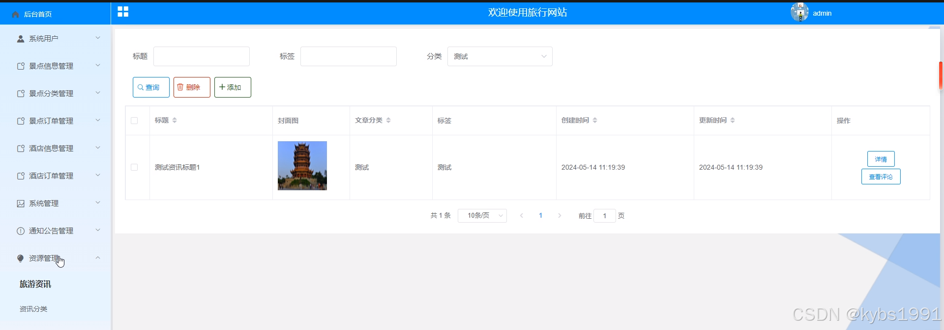 - 资源管理:在“资源管理”菜单管理员对旅游资讯和资讯分类信息进行管控,可以对旅游资讯、资讯分类信息进行查询、添加和删除操作。