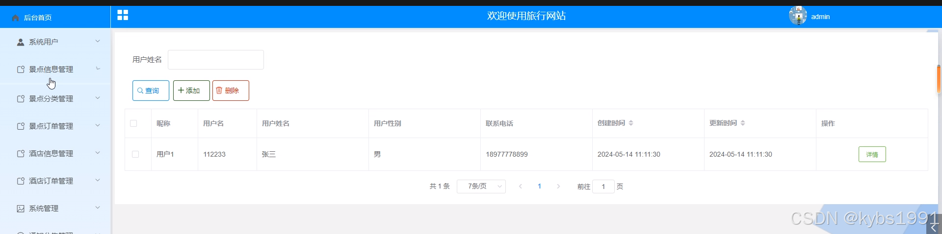 - 系统用户:管理员可以查看系统用户(管理员、普通用户)列表中某一用户的详情,可以对系统用户信息进行查询、添加和删除操作。