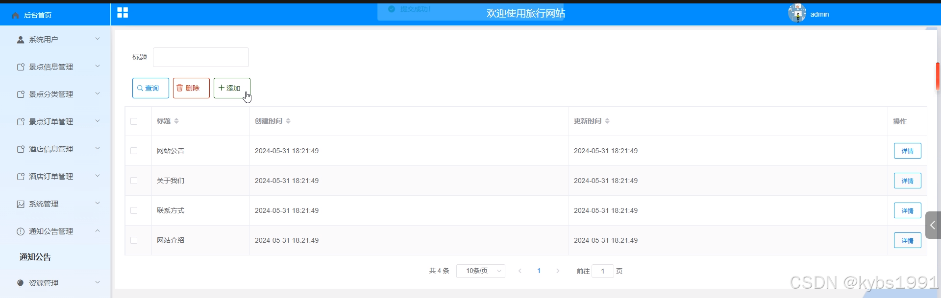 - 通知公告管理:通知公告管理界面是管理员用来管理系统中的通知公告的界面,可以对通知公告信息进行查询、添加和删除操作。