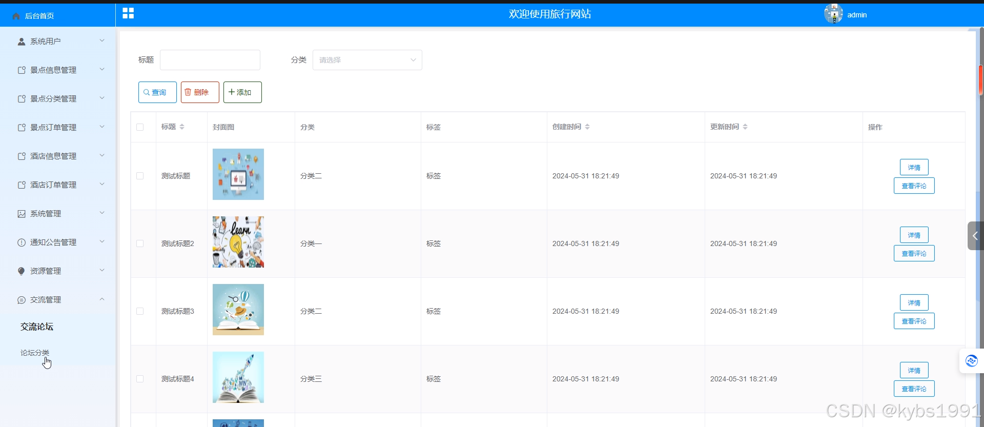- 交流管理:在“交流管理”菜单管理员对交流论坛和论坛分类信息进行管控,可以对交流论坛、论坛分类信息进行查询、添加和删除操作。