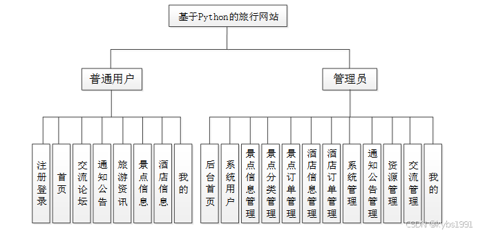 按照基于Python的旅行网站的角色,主要包括普用户模块和管理员这两大功能模块,各模块功能如下。