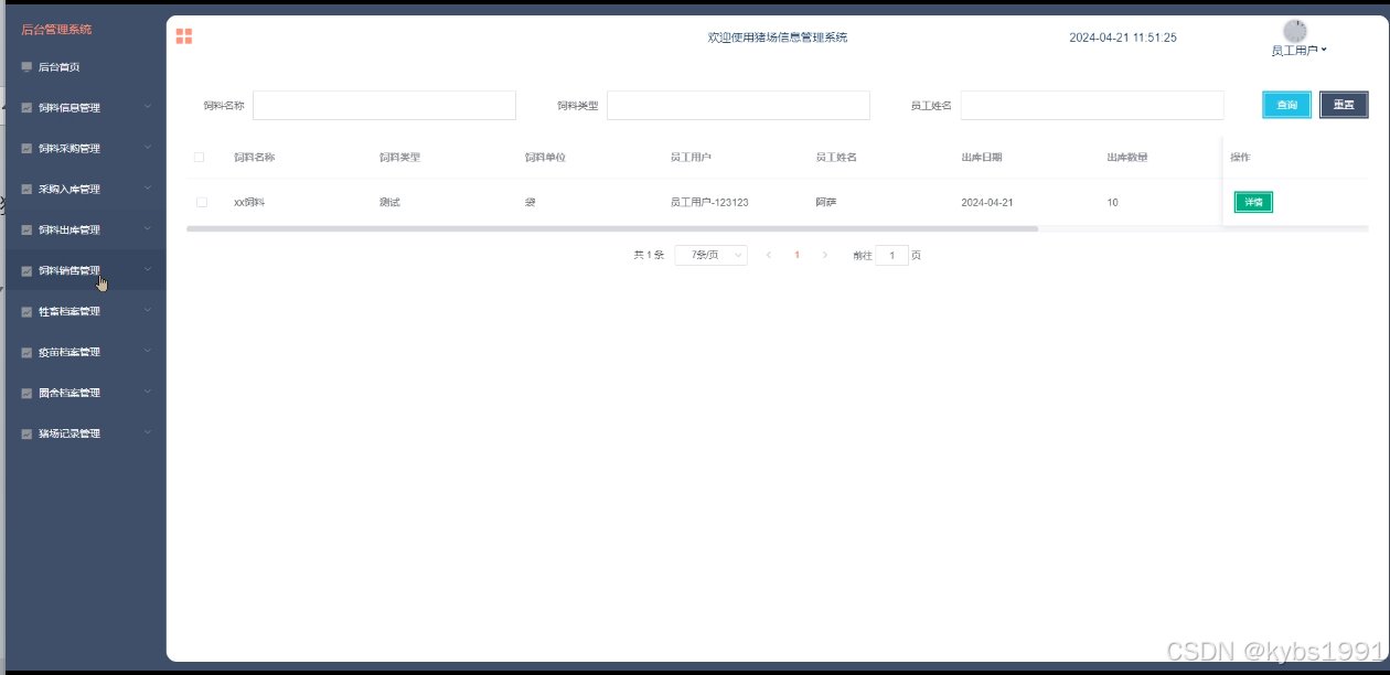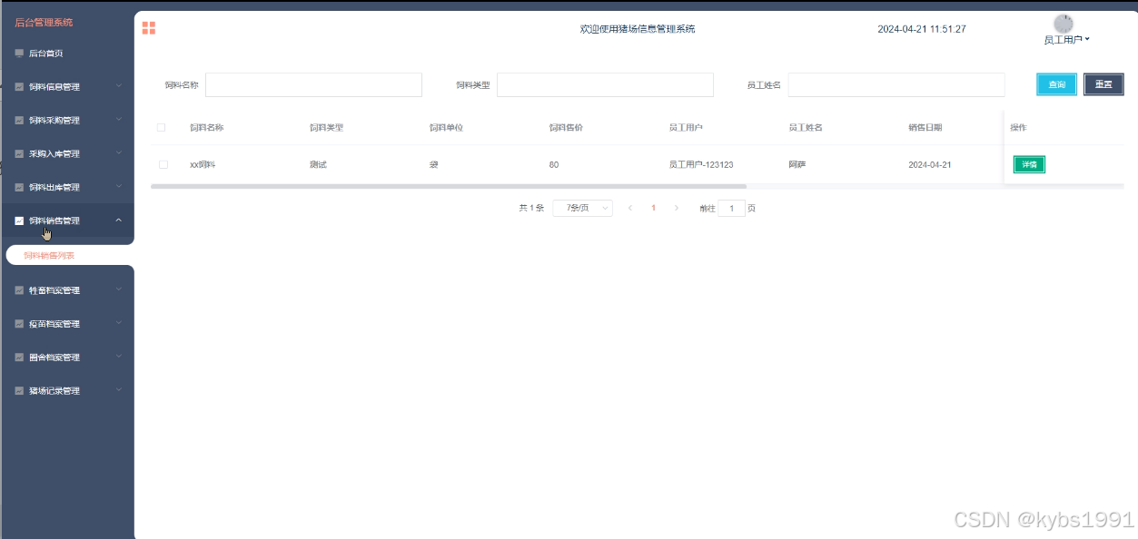 饲料销售管理模块:用户点击“饲料销售管理”,可以想到所有饲料销售详情,界面如下图所示。