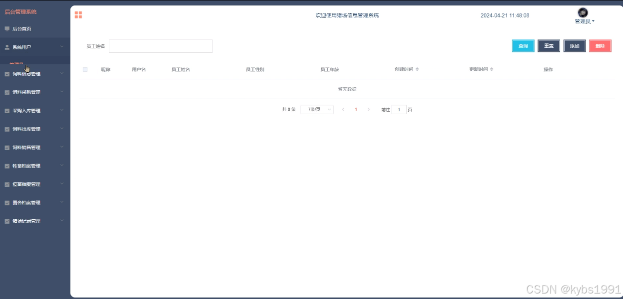 在员工用户模块中,后台首页作为系统的入口,提供了直观的操作界面和便捷的导航功能,使员工能够快速进入各项管理模块。饲料信息管理模块实现了对饲料种类、成分、库存等信息的全面记录与查询,确保饲料使用的科学性和安全性。饲料采购管理则负责饲料采购计划的制定和供应商信息的维护,优化了采购流程。采购入库和饲料出库管理则实现了饲料库存的实时更新和追踪,确保饲料的合理使用。饲料销售管理关注饲料销售数据的统计和分析,为猪场的经济效益提供了数据支持。此外,牲畜档案管理、疫苗档案管理、圈舍档案管理以及猪场记录管理等功能模块,分别涵盖了牲畜健康、疫苗接种、圈舍使用以及日常记录等方面的管理需求,提升了猪场管理的精细化和智能化水平。