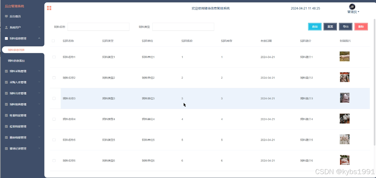 点击左侧菜单“饲料信息管理”,页面跳转到饲料信息管理外观,调用后台查询所有饲料信息。并将信息密封到数据集合List,绑定到请求对象,然后页面跳转到相应的Java页面,显示出饲料信息,单击删除按钮完成饲料信息的删除。
