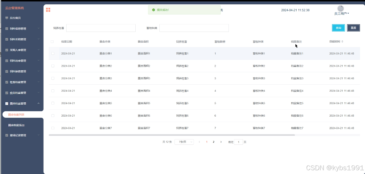 牲畜档案管理模块:员工用户点击“圈舍档案管理”页面可以查看相关详情。界面如下图所示。