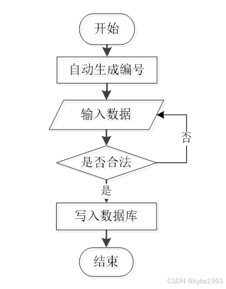 用户成功登入系统后就能够实现增加数据的操作,增加数据的编号是特定的,系统生成,用户不能随意填写,除了编号以外,其他增加信息用户自己填写,填写后的信息经过系统验证,验证合法通过就显示增加数据成功了,相反的话,就没有增加成功,图3-1显示的就是在增加数据时的流程。