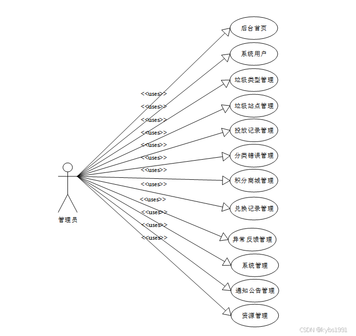 在管理员功能页面中可以查看后台首页、系统用户、垃圾类型管理、垃圾站点管理、投放记录管理、分类错误管理、积分商城管理、兑换记录管理、异常反馈管理、系统管理、通知公告管理、资源管理等功能,并可进行相应操作。管理员功能界面如下图所示。