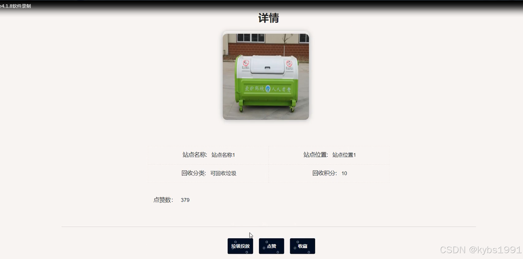 社区用户可以查找附近的垃圾站点信息,包括位置、分类要求等。在详情页可以进行垃圾投放、点赞和收藏。垃圾站点界面如下图所示。