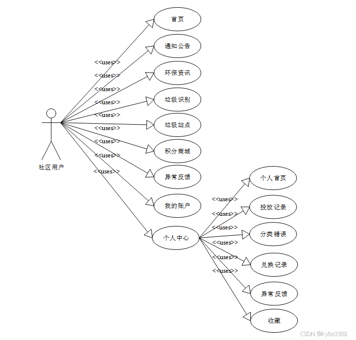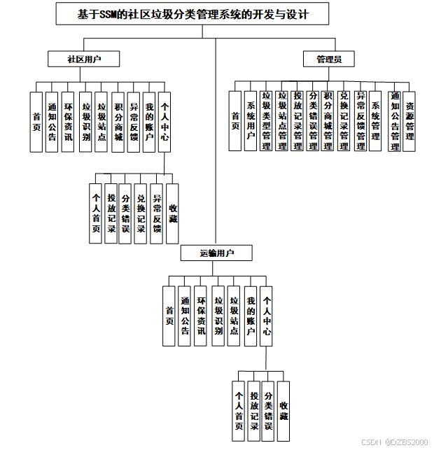 按照社区垃圾分类管理系统的角色,划分为了社区用户模块、运输用户模块和管理员模块这三大部分。