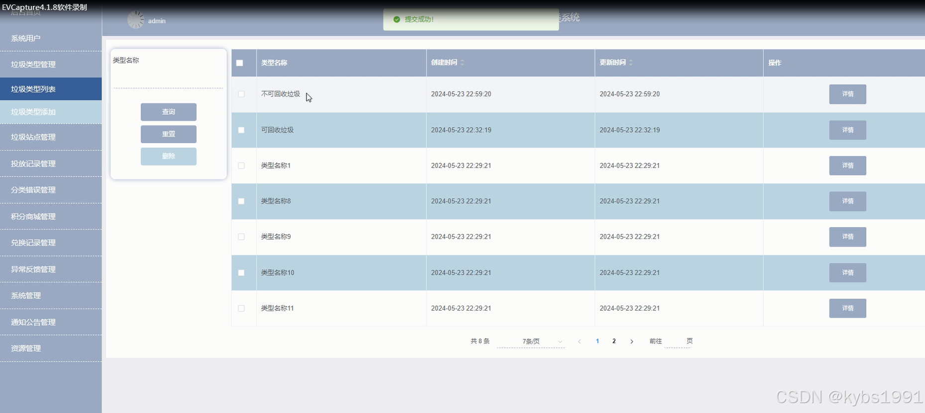 管理员可以管理系统中的垃圾类型,包括添加新的垃圾类型、修改垃圾类型信息、删除垃圾类型等。垃圾类型管理界面如下图所示。