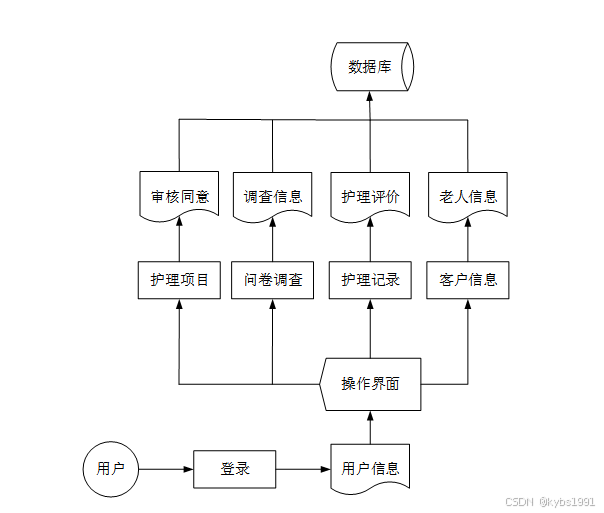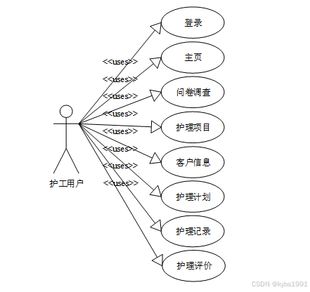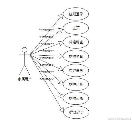 养老用户功能模块有主页、问卷调查、护理项目、客户信息、护理计划、护理记录、护理评价等功能模块。养老用户用例图如下所示。