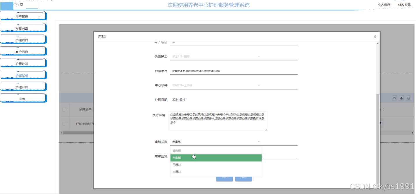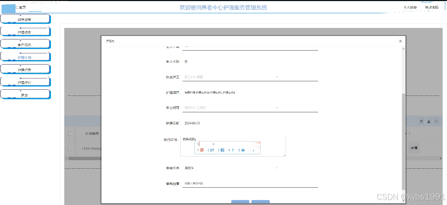 当前台护理用户点击养老中心护理服务管理系统中的“护理计划”后将会进入到“护理计划”列表的界面,然后选择想要查看的护理计划信息,护理用户可对已护理的老人添加护理记录信息,如:护理日期、执行详情等信息,由领导用户进行审核,护理记录添加模块如下图所示。