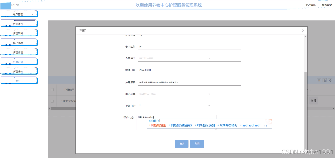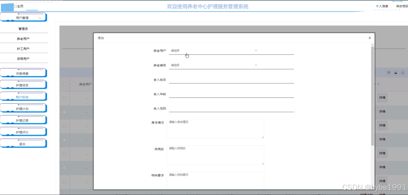 在系统前台中主要实现的是对养老中心护理服务管理系统中信息的浏览、评价,养老用户主要查看护理计划并进行审核同意,对养老中心的问卷调查进行填写由管理员进行审核,对护工的护理工作进行评价等功能。