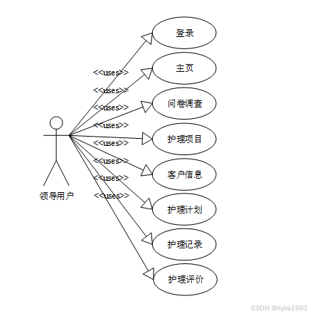 领导用户账号密码由管理员在后台添加,登录进入系统之后可以对个人信息和密码进行修改,其管理模块主要对问卷调查、护理项目、客户信息、护理计划、护理记录、护理评价进行管理。养老用户用例图如下所示。
