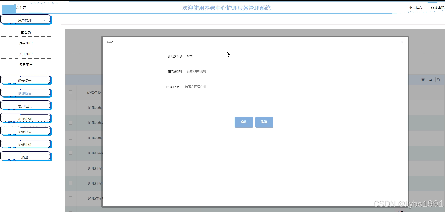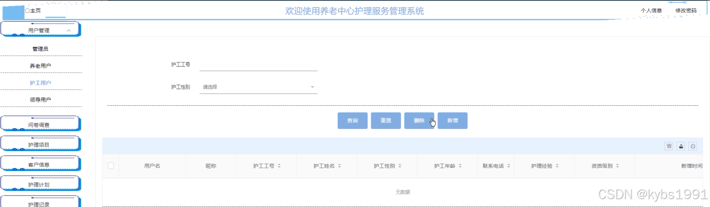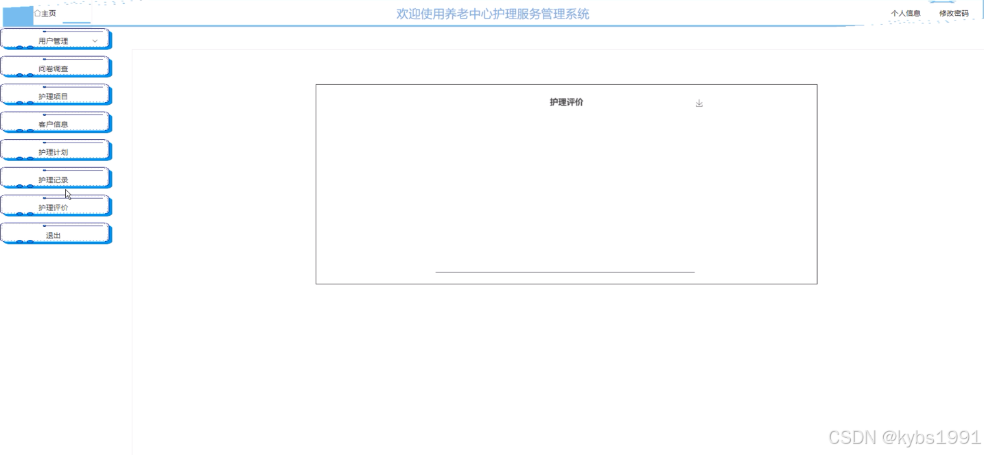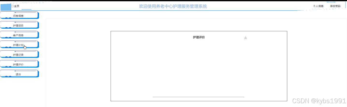 护工用户账号密码由管理员在后台添加,登录进入系统之后可以对个人信息和密码进行修改,其管理模块主要对护理项目、客户信息、护理记录、护理计划、护理评价进行管理。护工用户后台管理界面如下图所示。