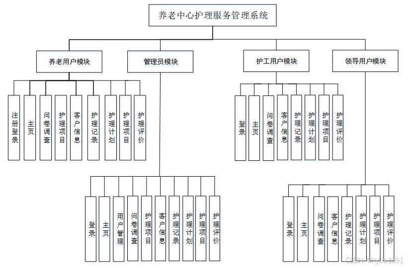 养老中心护理服务管理系统的功能主要分为养老用户、护工用户、领导用户和后台管理员一共四个角色,其中护工用户账号和领导用户账号由管理员后台添加登录。